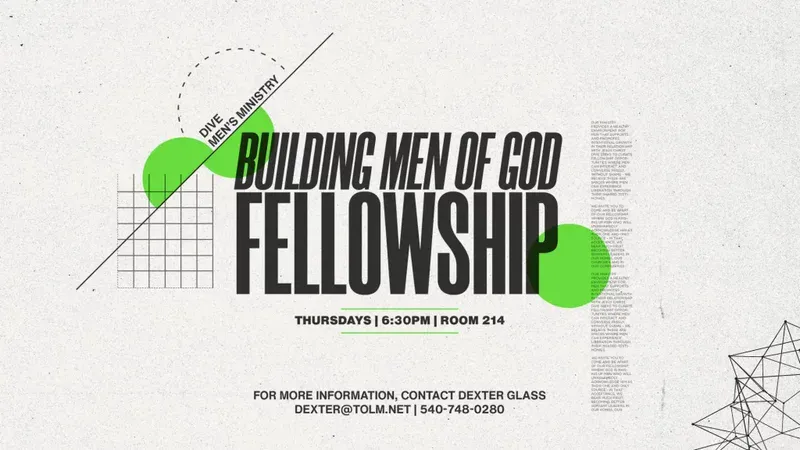 DIVE Men’s Ministry is currently holding a “Building Men of God” Fellowship every Thursday night at 6:30 PM through September 25th. For more information, please contact Dexter Glass.